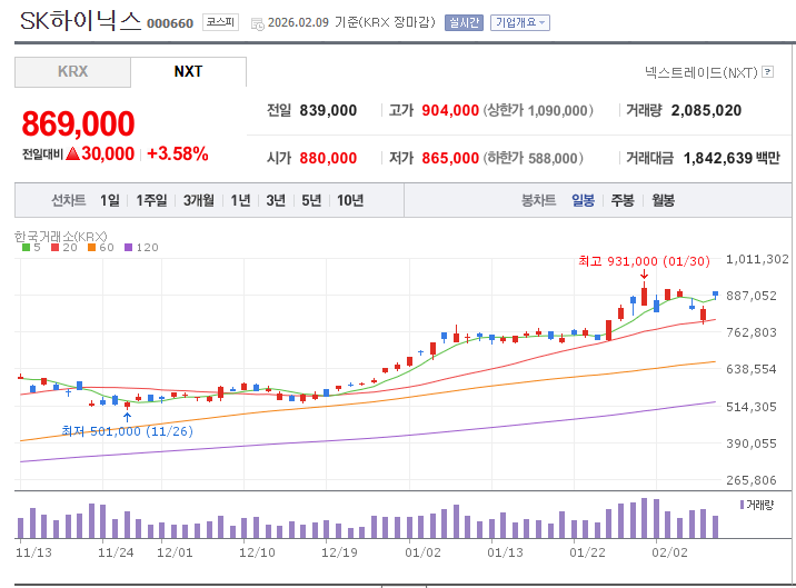 - 전고점 돌파 시도: 1월 30일 931,000원 터치 후 현재는 건강한 눌림목 형성 중(869,000원).